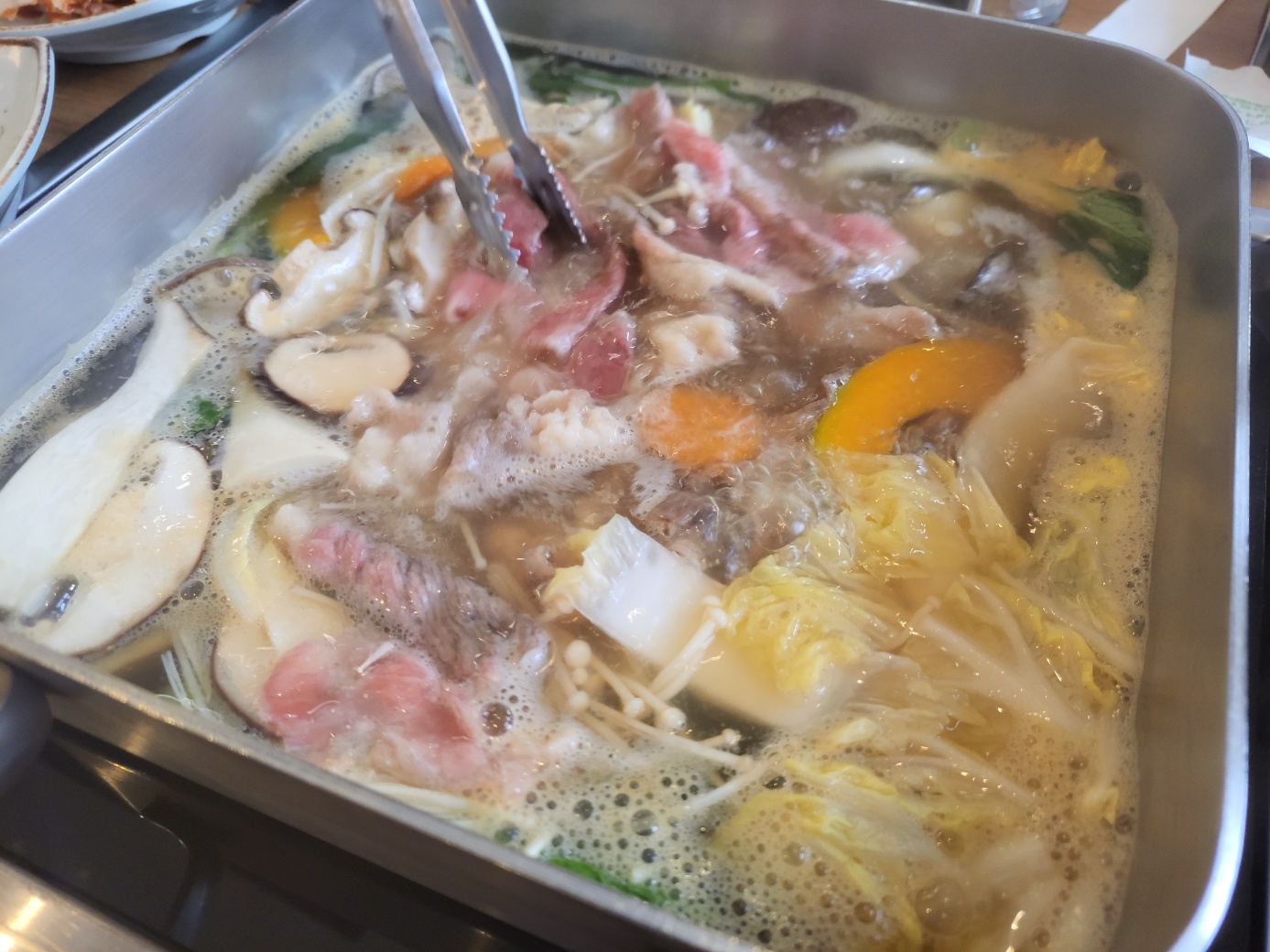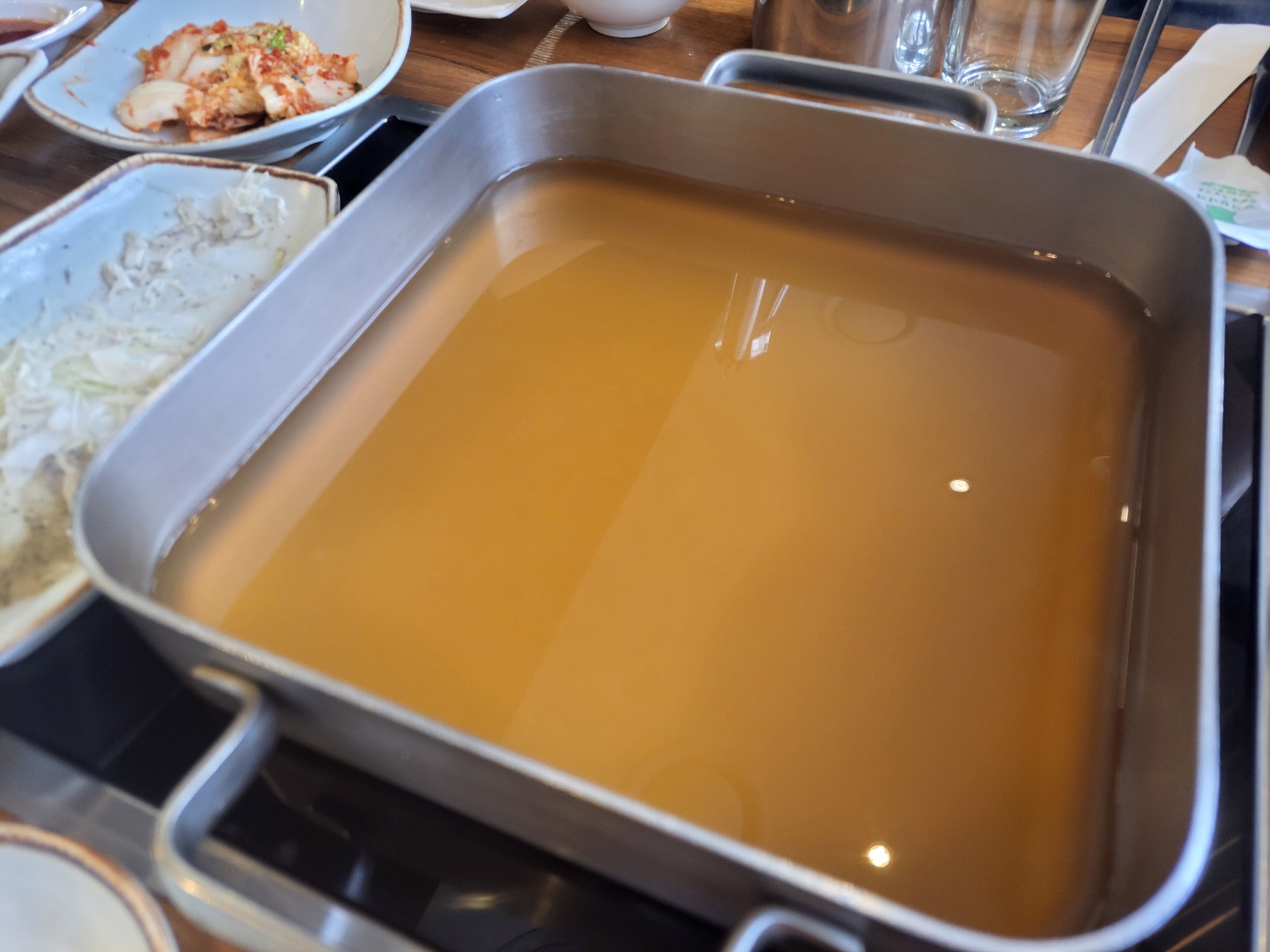 이곳의 샤브샤브 육수는... 이것도 또 아는 맛인데 좀 다른 그런 느낌이었다. 기본적으로 누구나 아는 샤브 육수의 맛인데 아까 전에 봤던 월계수 잎과 알 수 없는 향신료 때문인지, 아니면 편백찜을 하며 떨어진 버섯 육수 때문인지 육수에서 묘한 향신료 향이 난다. 이 점이 색다르게 느껴졌고, 향신료 덕분에 진한 고기 육수가 되었을 때도 전체적으로 육수가 깔끔한 맛이 나서 좋았다.