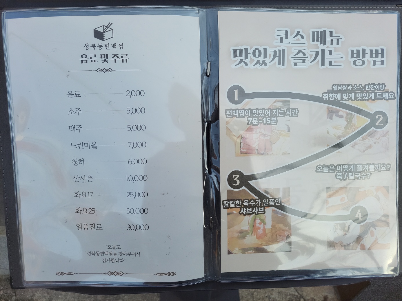 특이한 메뉴가 있다거나 놀랄만큼 맛있는 곳은 아니다. 서울 전체로 지역을 한정하면 보면 가격도 저렴하다고는 할 수 없다. 하지만 파스타도 20,000원, 샌드위치도 11,000원 하는 극악스러운 성북동의 물가를 생각하면, 성북동에서 이렇게 푸짐한 양의 편백찜(+샤브샤브)을 25,000원에 먹을 수 있다는 게 가성비가 좋은 거라는 개인적인 생각이다.