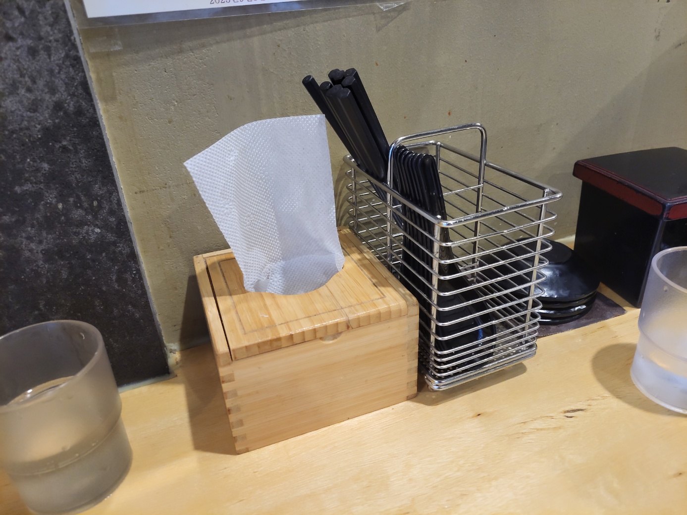 내부는 이렇게 생겼다. 현관에서 가까운 쪽엔 바형 테이블이 있고 안쪽에는 서로 마주 보고 앉을 수 있는 일반 테이블이 위치해 있다. 처음 딱 발을 들이면 약간 꼬릿한 냄새가 나는데 아마 돼지 육수 때문인 것 같다.