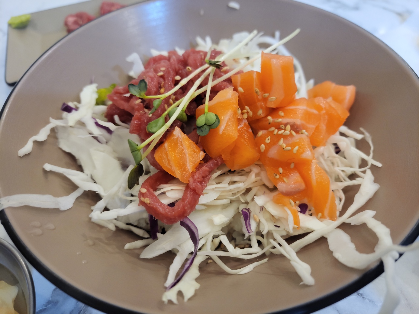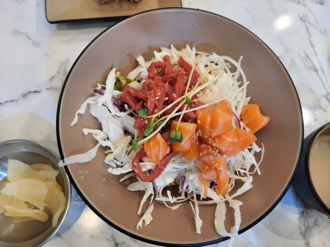 혼자서 세트 두 개 먹은 거 아니고 다다음 날 또 방문했다. 육회초밥이 너무 맛있었기 때문이다 ㅋㅋㅋㅋ 이번에 시킨 육연덮밥세트는 육회와 연어를 섞어서 토핑으로 올려주고 여기도 육회 초밥 2피스를 준다.