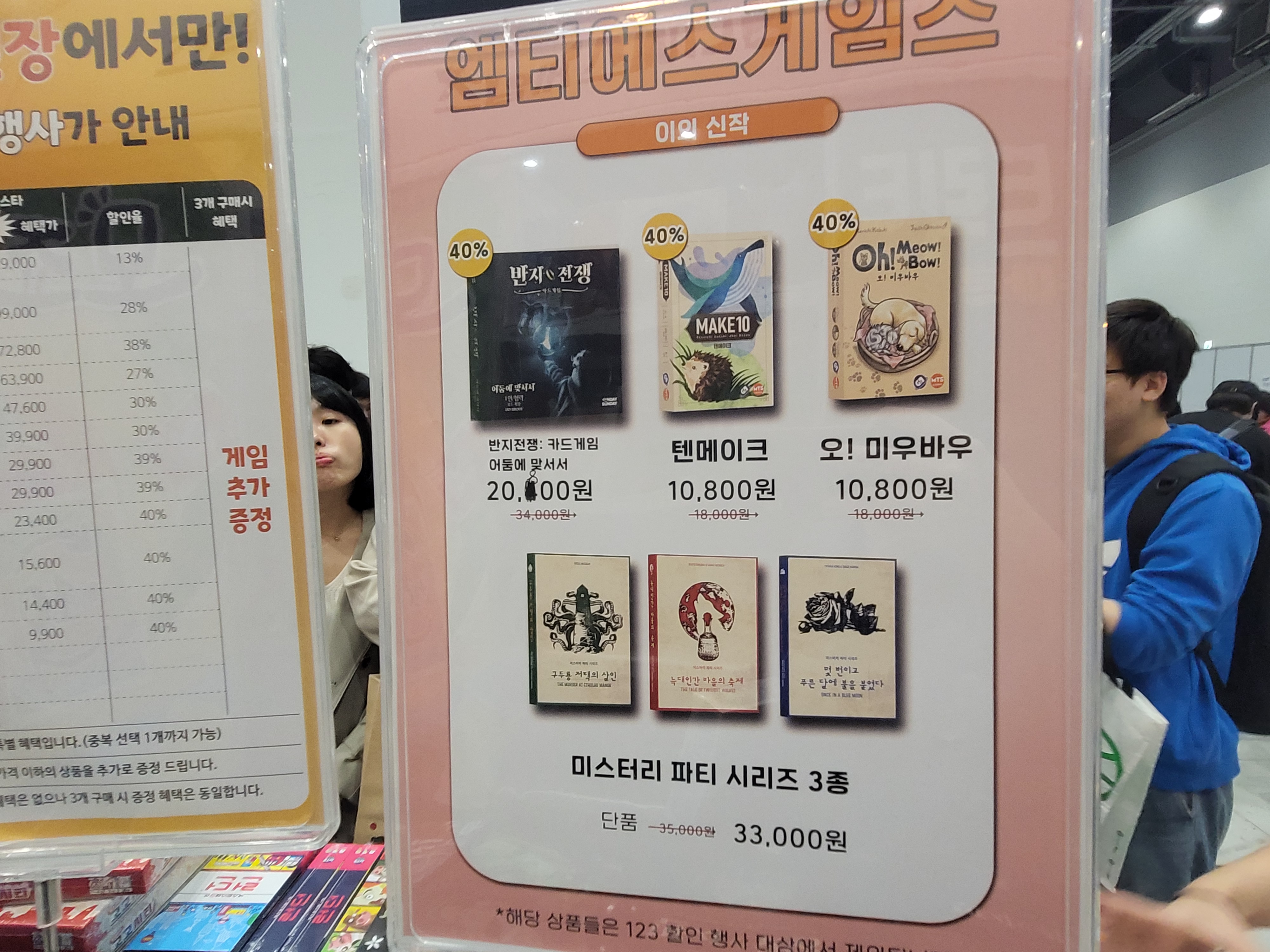 신작으로 <미스터리 파티 시리즈>라는 크라임씬? 과 <텐메이크>, <오! 미우바우>라는 카드게임 등이 있었다. 크라임씬을 좋아하는 일행이 미스터리 파티 시리즈 중 하나를 샀는데 인원을 못 구해서 아직까지도 못 돌렸다고 ㅋㅋㅋㅋ