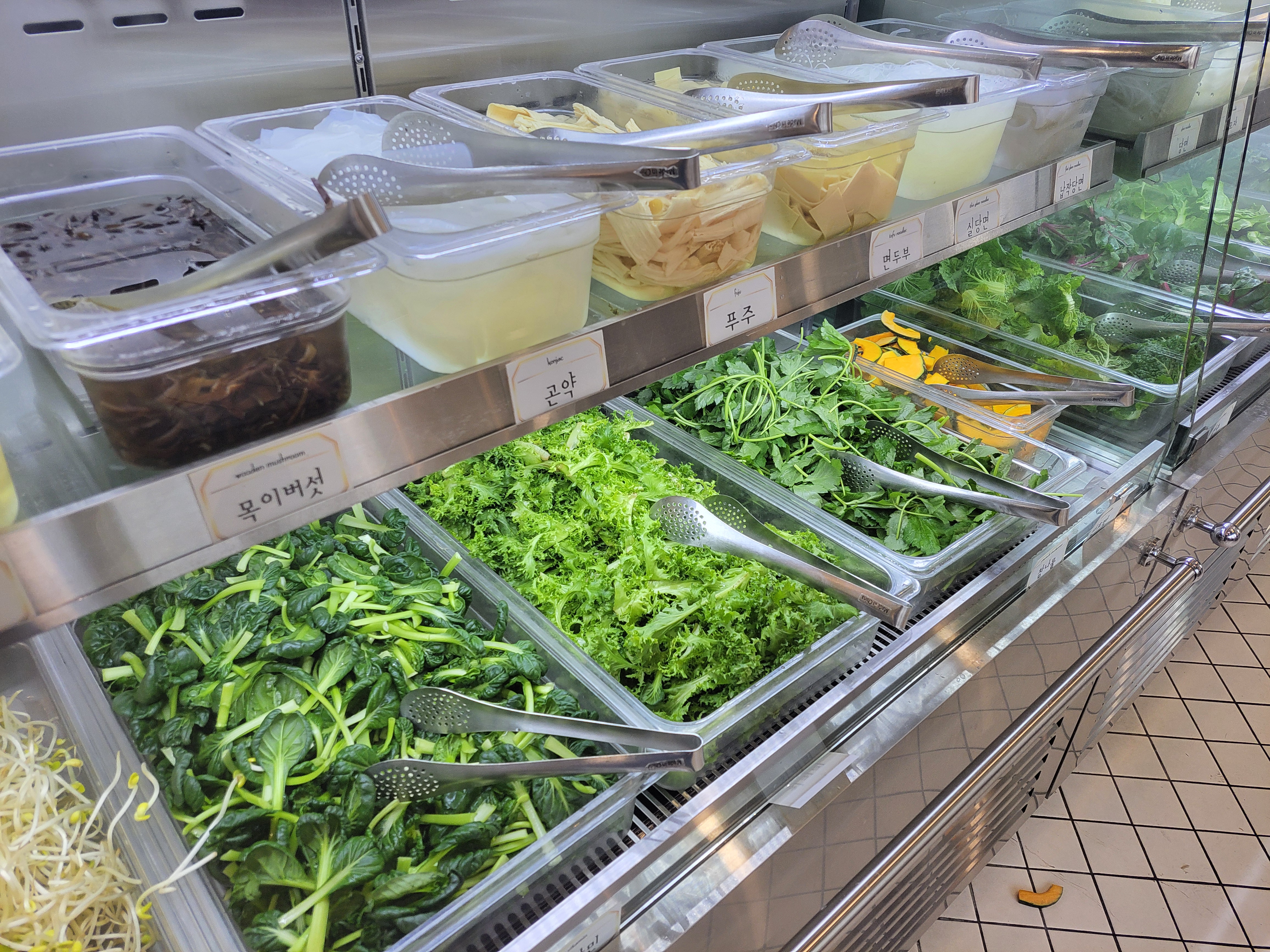 셀프바에는 목이버섯, 곤약, 푸주, 당면 종류 같은 마라탕용부터 비타민, 참나물, 근대 같은 다양한 종류의 야채가 있다. 칼국수 면도 색 별로 있어서 아이들이 즐거워할 느낌이다.