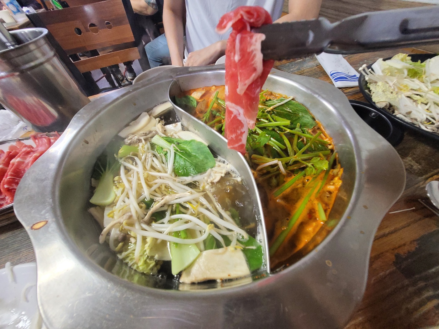 이 인분에 어울리는 야채를 퍼서 자리에 왔더니 육수와 고기가 세팅이 되어 있었다. 이곳은 추가금 없이 육수를 반반으로 먹을 수 있다! 매운 육수가 꽤 매운 편이라서 먹다 보면 기침이 나오곤 하는데, 그건 내가 맵찔이라서 일지도.. ㅎ