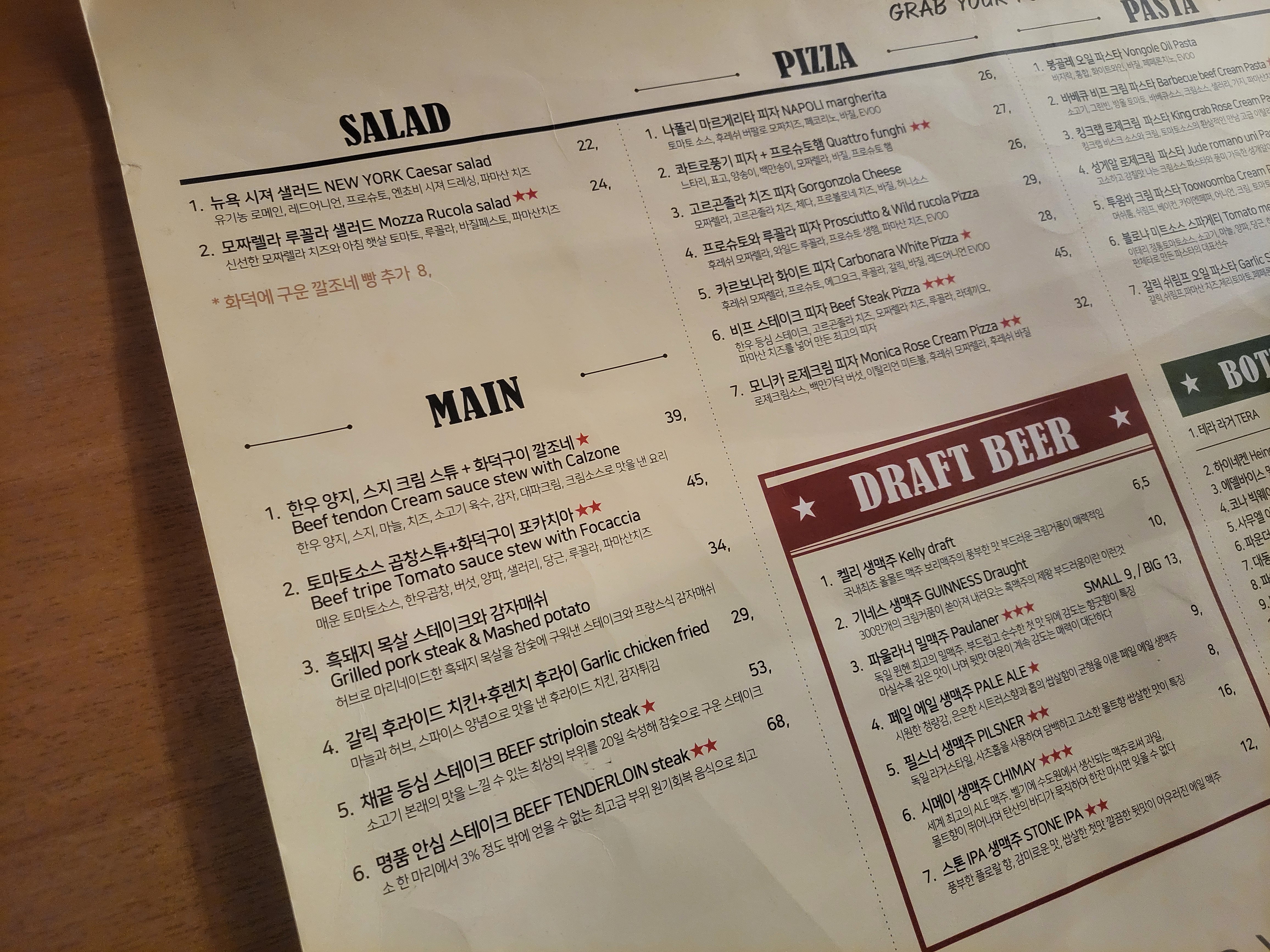 화덕 피자를 하는 흔한 펍이라고 생각했는데 메뉴를 보니 도전의식을 불러일으키는 것들이 꽤 있다. <한우 양지 스지 크림 스튜 + 화덕구이 깔조네>는 스지가 깔쪼네에 어떻게 들어가는지가 궁금했고, <성게알 로제 크림 파스타>는 이색적으로 맛있거나 아니면 비릴 것 같았다.