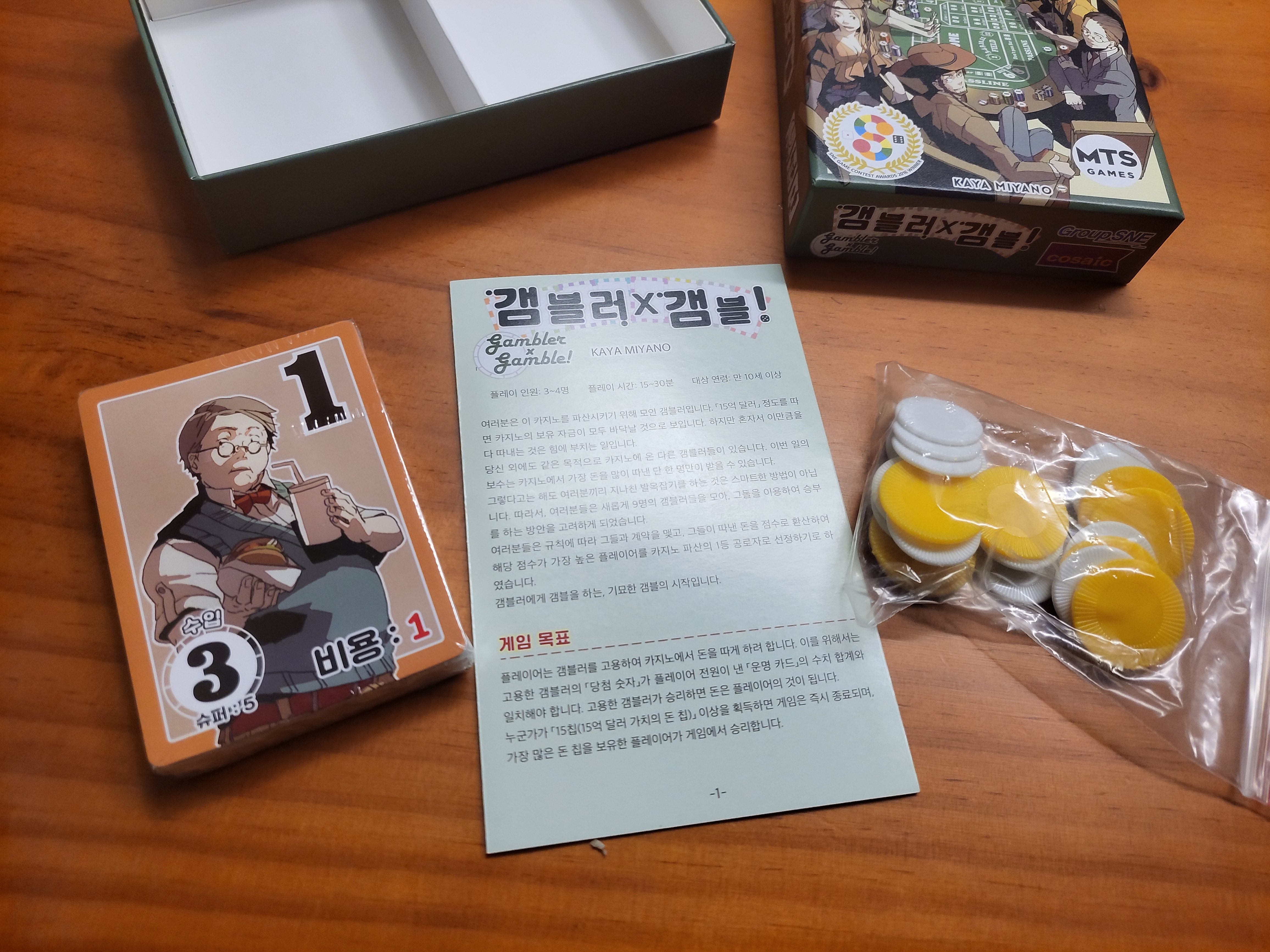 이 게임은 진짜 재미있는데 3-4인이지만 4인이 되어야 게임을 할 만해서 사실상 4인 원툴 게임이다. (변형 규칙으로 5인까지 하는 사람도 있다곤 함) 그리고 블러핑을 해야 하는 게임들이 그렇듯 협잡질도 하고 후발주자들끼리 선두주자를 담그기도 하는(?) 등 상호작용 요소가 활발하다 보니 잘못하면 누군가가 삐지게 될 수 있다. 하지만 그런 요소만 아니라면 진짜 재미있는 게임이니까 4인 파티게임에는 <갬블러 x 갬블!>을 추천한다.
