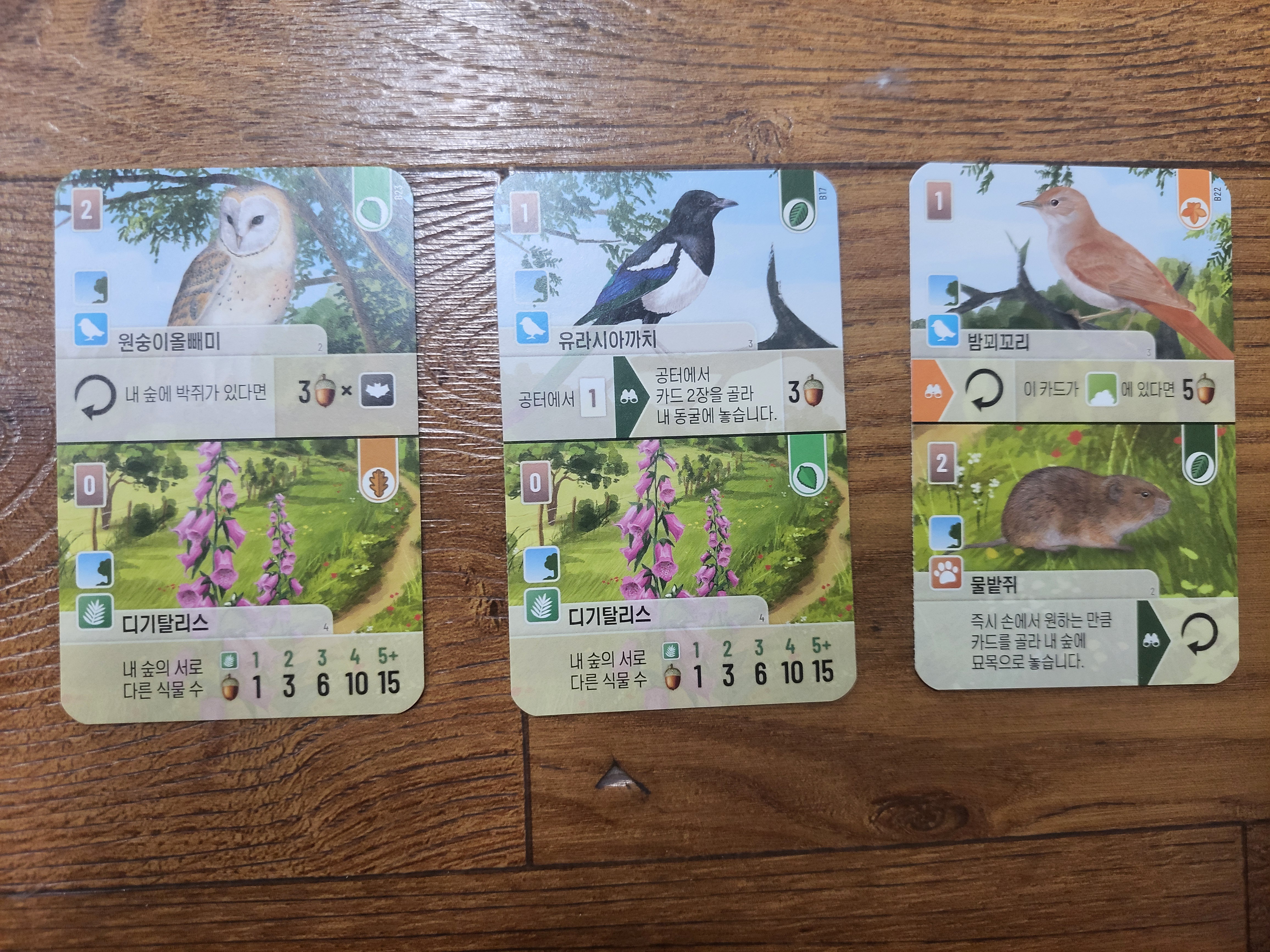 서양개암나무는 박쥐, 서양딱총나무는 식물, 가시자두나무는 나비 카드로 점수를 얻을 때 유용할 듯하다. 본판을 할 때 나비나 박쥐 조합의 경우 점수를 크게 내기 힘들어서 금새 포기하곤 했는데, 그런 부분에서 <포레스트 셔플: 숲의 변두리> 확장이 밸런스를 맞춰줄 수 있을 것 같다.