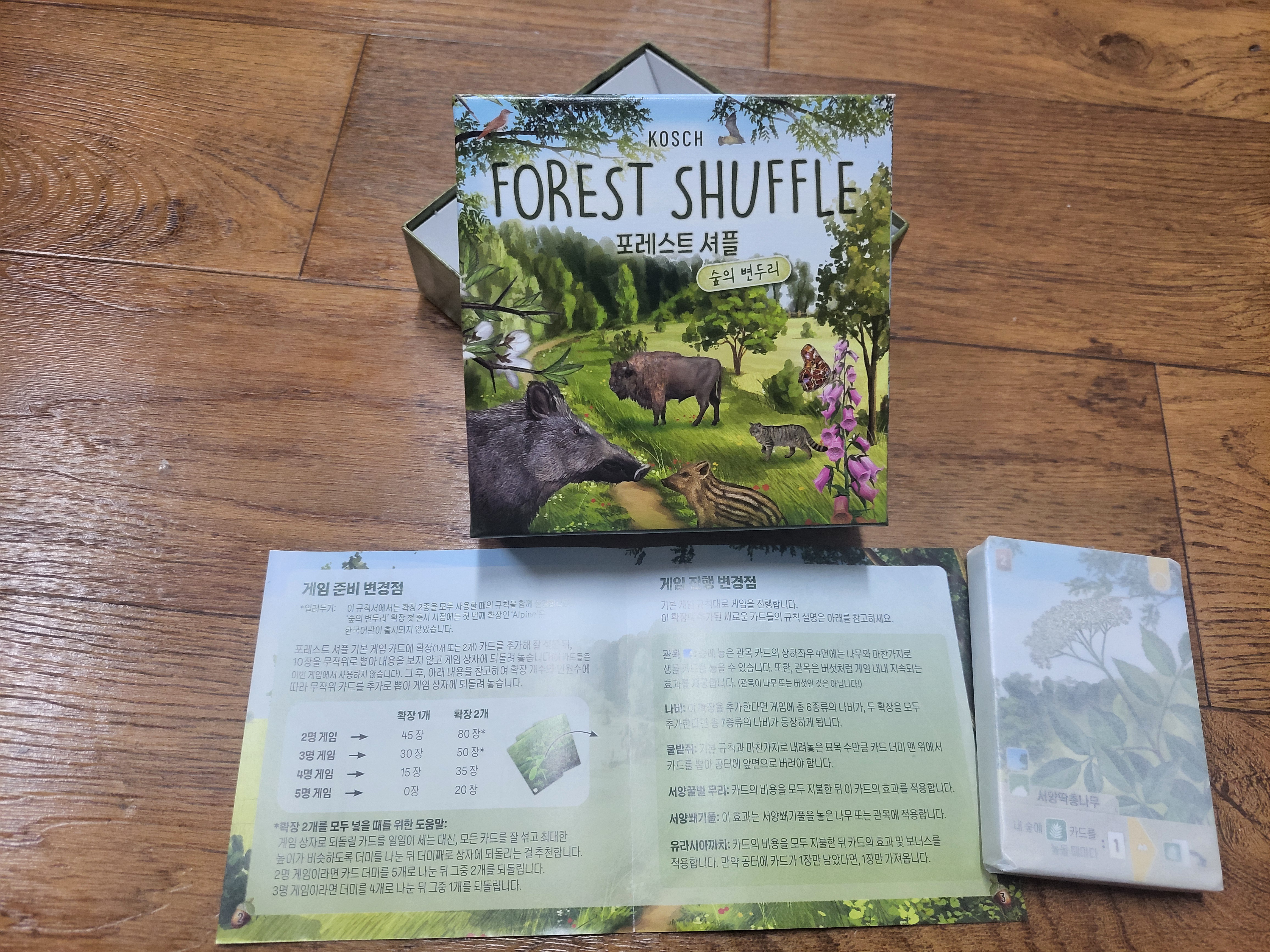 2024년 하반기에 샀던 게임 중에서 가장 재미있게 하고 있는 게임이 바로 2024 독일 올해의 게임상 1위를 수상했다는 보드게임 <포레스트 셔플>이다. 각 세 개의 모임에서 두 번씩 돌렸으니까 본판은 뽕을 뽑고도 남은 셈. 본판에 대해서도 블로그 글을 써 놓았으니 본판을 살지 말지 고민하는 분은 아래를 클릭해 본판 후기를 먼저 읽어보길 바란다.