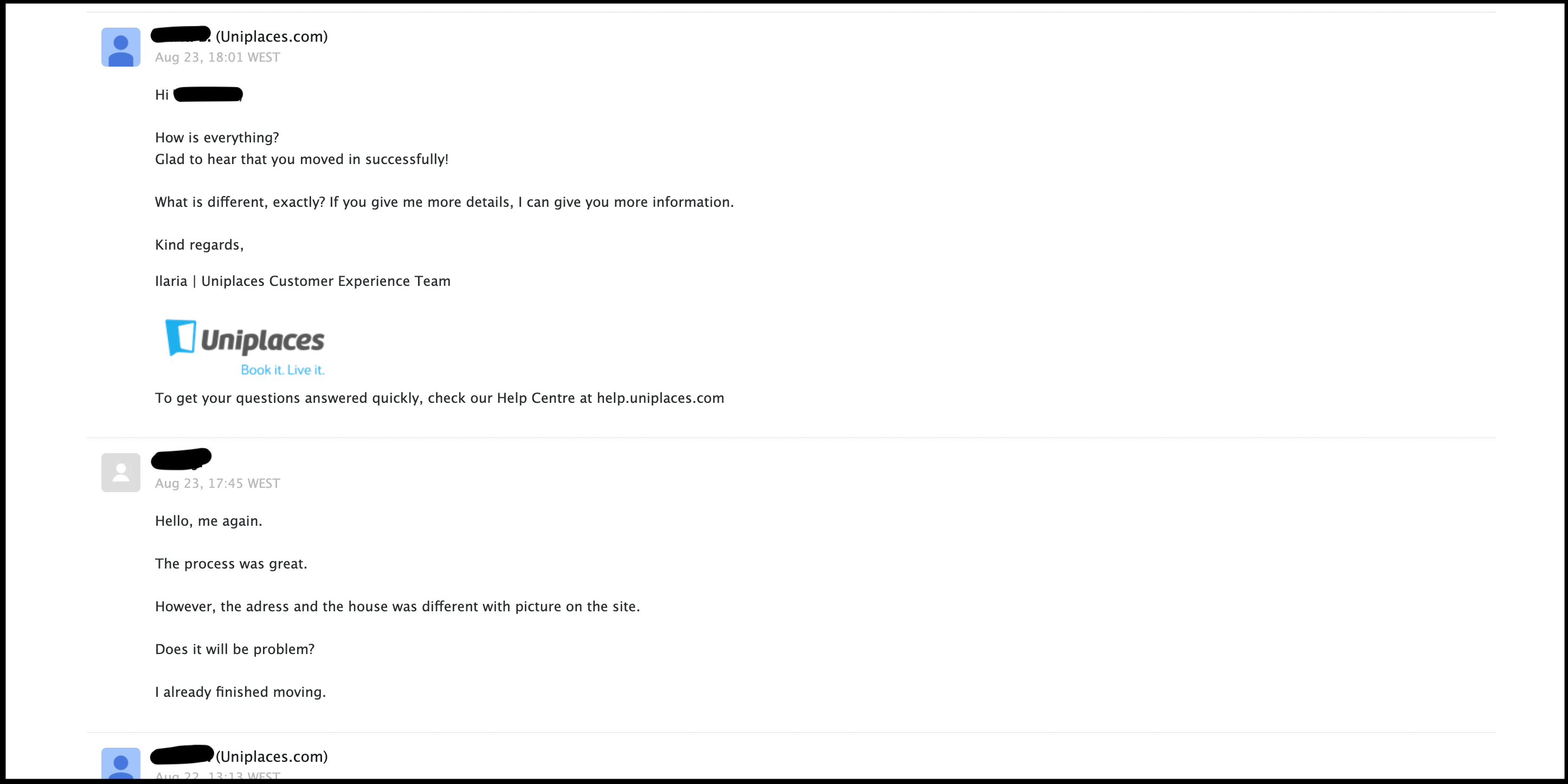 사실 집주인에게서 받은 주소가 중개사이트(uniplaces)의 주소와 달랐던 순간부터 나는 uniplaces와 연락을 주고받고 있었다. 그 이유는 1. 사이트에서 중개해 준 집과 다른 집에 거주하는 게 정책 상 문제가 될지 2. 이런 상황에서도 중개사이트의 도움을 받을 수 있는지 궁금했기 때문이다.