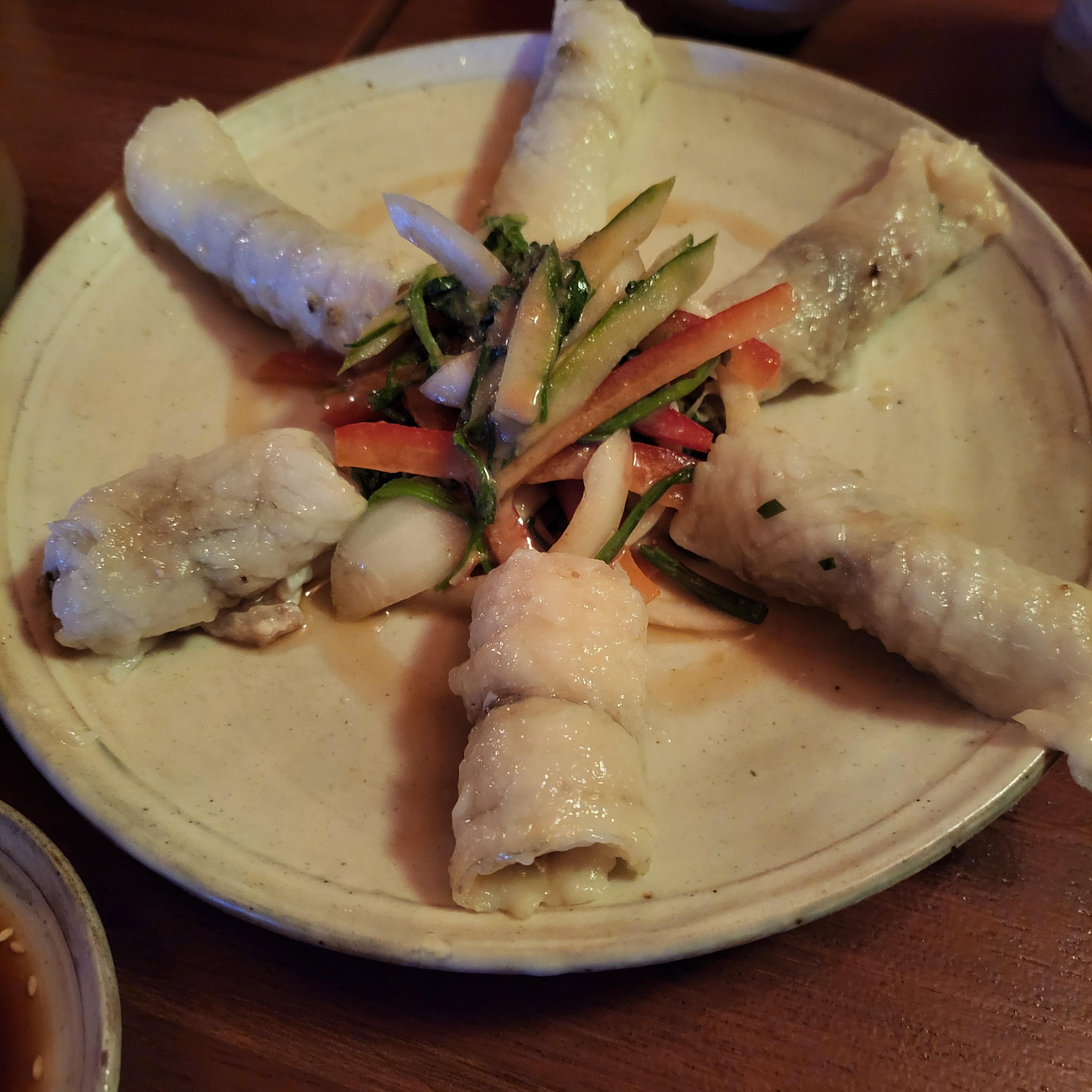 정확히 기억은 안 나지만 1만 원 중후반 ~ 2만 원 초반 사이의 가격이었던 것 같다. 세 명이 가서 하나 시켜서 두 개씩 먹으면 딱이다. 실제 생선을 편으로 썰어서 안에 소를 넣고 돌돌 만 것인데 사진에서 보다시피 크기에 차이가 있다. 가장 큰 부분을 나눠서 먼저 먹고 이후엔 눈치 싸움하면서 무언의 조율을 통해 두 번째 조각을 집으면 된다.