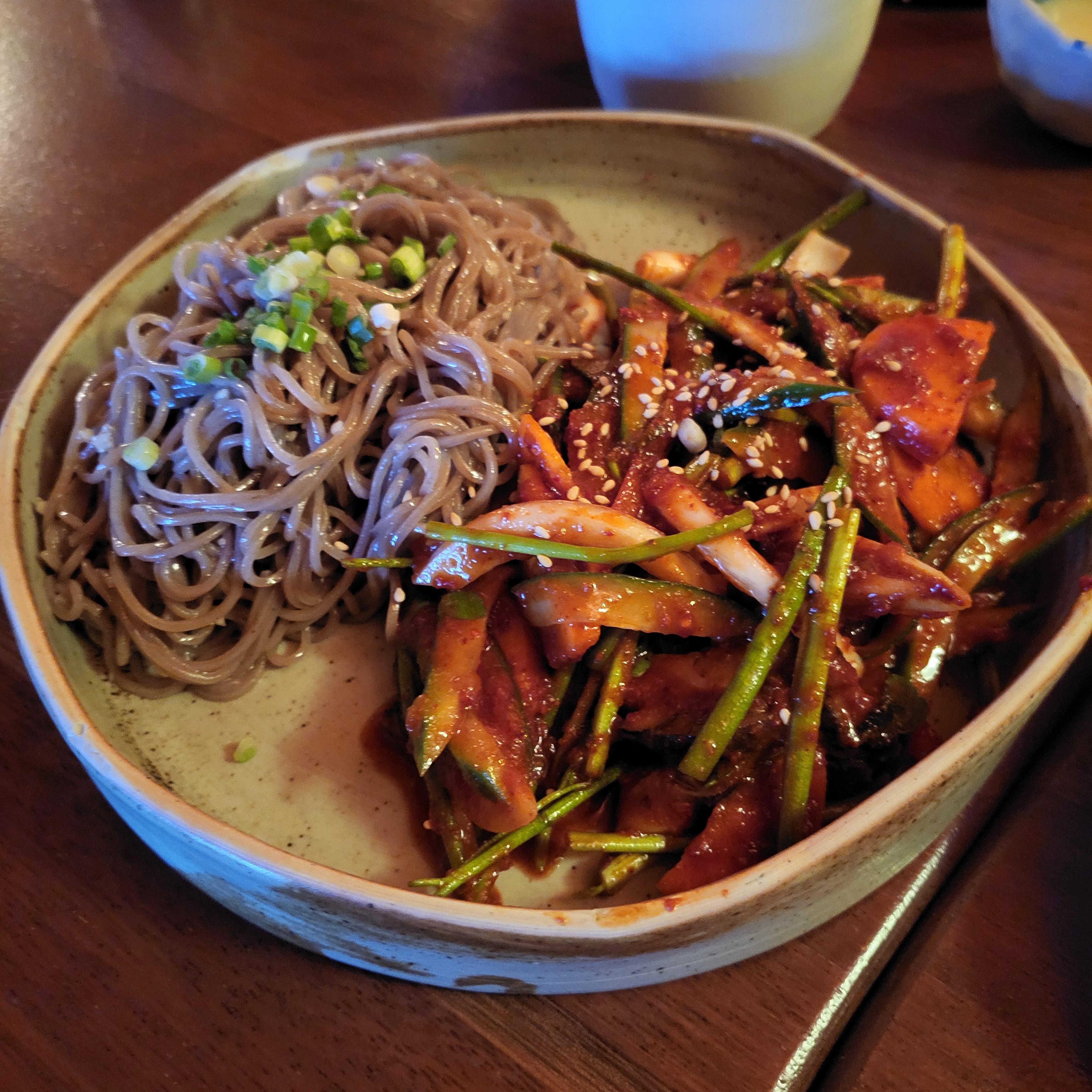 익숙한 골뱅이 소면의 느낌. 근데 이제 면이 메밀면으로 바뀐 거다. 왠지 모르지만 야채가 맛있었다는 기억이 있다. 익숙한 맛이라 맛있게 먹었다. 다른 블로그를 뒤져보니 소라 무침은 18000원 메밀면 추가는 4000원인 모양이다.
