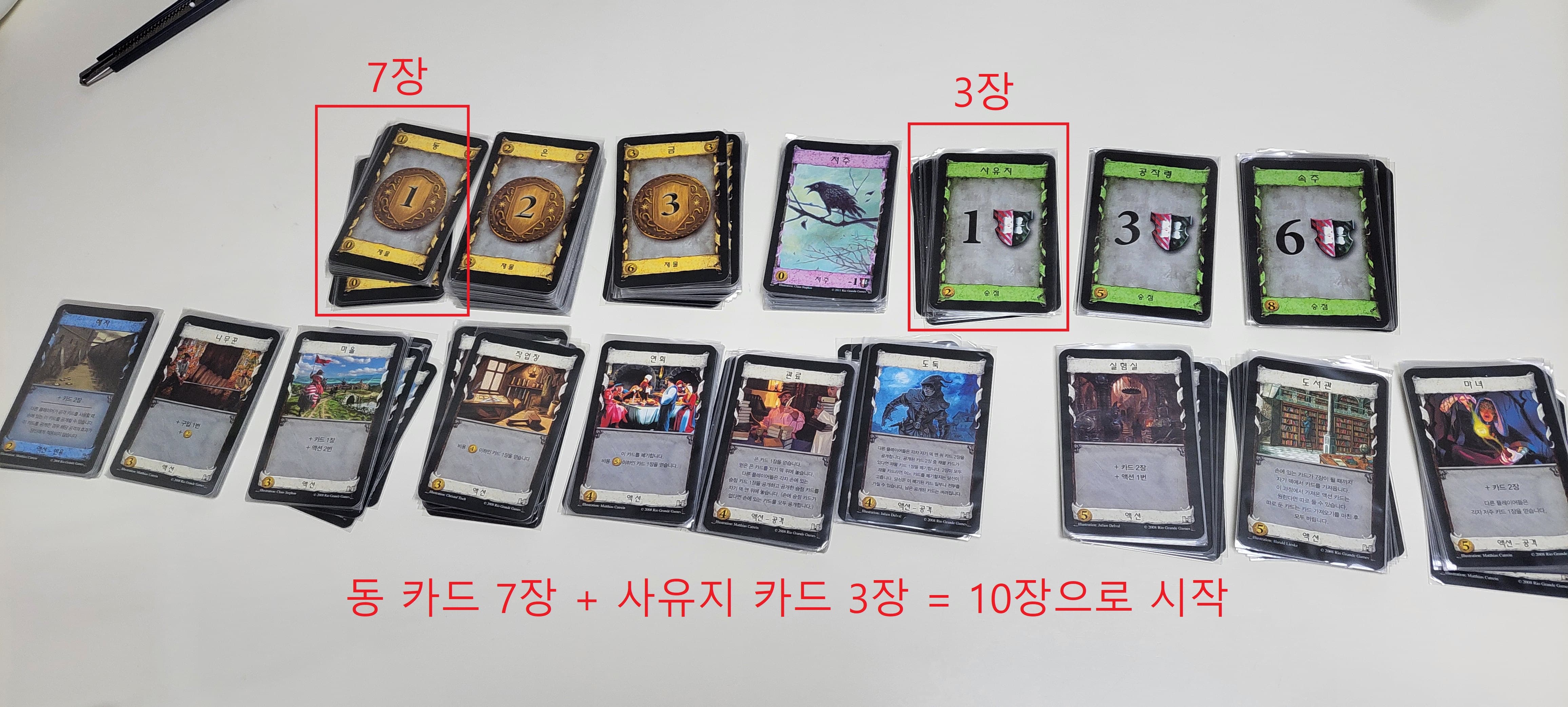 모든 플레이어는 처음에 동 카드 7장 사유지 카드 3장을 손에 쥐고 시작한다. 확장판에 따라 재물 카드(사진의 노란색 카드)와 승점 카드(사진의 초록색 카드)가 추가되기도 한다. 하단에 일렬로 놓인 것은 액션 카드로 랜덤으로 10종류를 사용한다. 우리는 M님이 가진 어플을 통해서 플레이에 사용될 10 종류의 액션 카드를 선택했다. 어플의 이름을 몰랐는데 찾아보니 Jack of all dominion이라는 어플 같다.