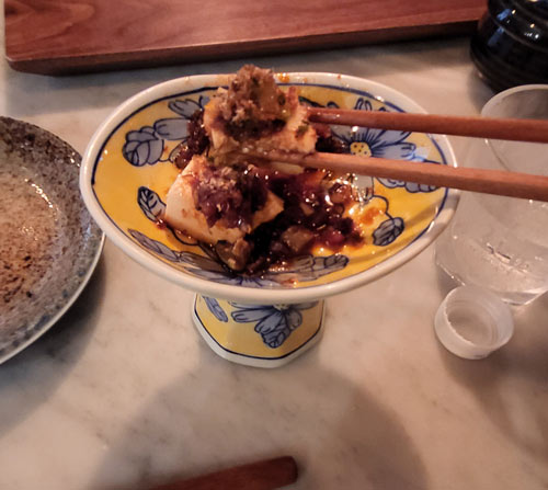 첫 스타트는 전체요리다. 가쓰오부시가 올라간 두부요리로 입맛을 돋워준다. 한국인에게 아주 친숙한 맛으로 고기가 들어가기 전에 먹기 딱 좋다.