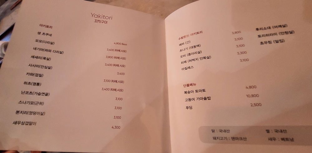 돈 많이 벌어서 메뉴판에 있는 26만 원짜리 사케도 시켜보고 싶지만 지금은 요원한 일이다. 전반적으로 고기가 질기지 않은 게 나에게 큰 점수를 얻었고(객관적으로 별로 쓸모없는 점수긴 하다. 그쪽에서 요청한 적도 없고.), 아직 못 먹어본 꼬치 요리도 많아서 한, 두번은 더 가보고 싶은 가게였다. 그럼 이만 포스팅을 마치겠다. 안녕.