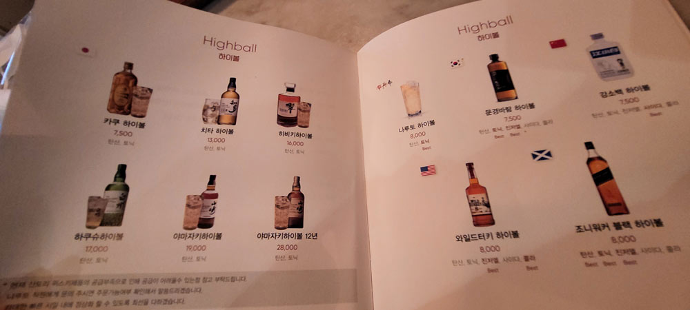 다양한 종류의 꽤나 가격대가 있는 하이볼이 준비되어 있다. 하지만 그날은 술을 많이 마시고 싶어서 30,000원짜리 화요를 시켰다.