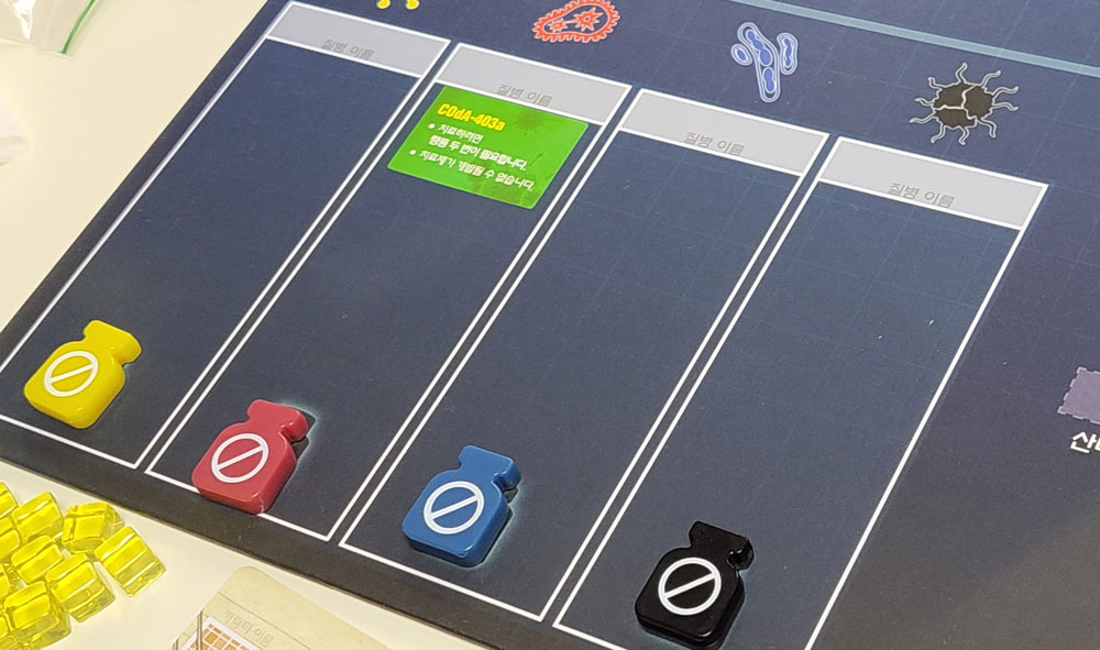 1월, 2월, 3월... 시간이 지나면서 전염병의 강력함과 전염성에도 변화가 생기고, 그에 따라 세계의 도시들의 상황도 달라진다. 사진에 보이는 C0da-403a는 이제 치료할 때 행동 2회가 필요하고 치료제 제작이 불가능하다. 저 초록색 스티커가 보이는가? 이렇듯 게임이 진행될수록 게임보드 위에는 스티커가 붙고... 보드는 회생할 수 없어진다.