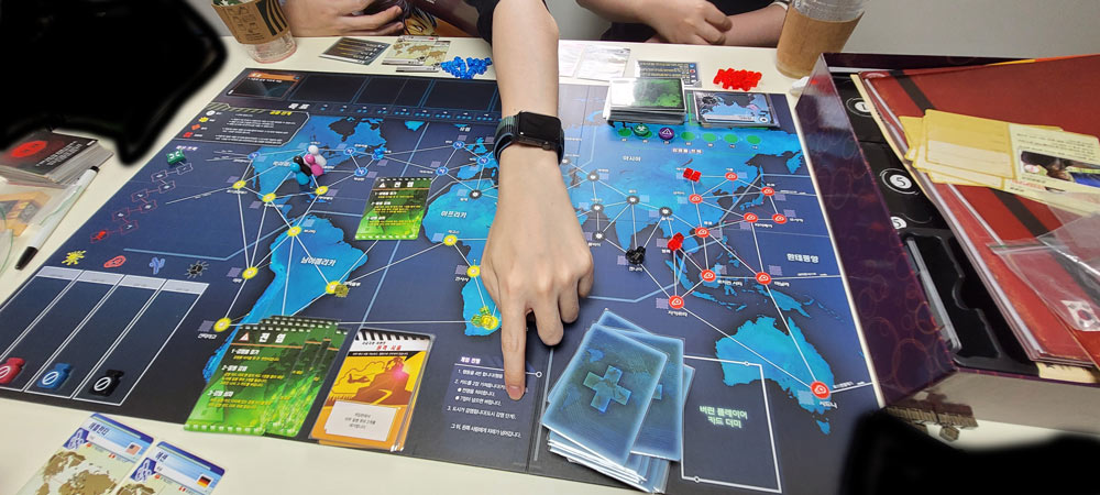 <팬데믹 레거시>는 유명한 게임인 팬데믹의 1회용 버전(?)이다. 'regacy(유산, 물려주는)'라는 이름이 붙은 만큼, 유저들이 진행한 플레이 내용이 게임 보드에 유산처럼 남는다. 뭔 말이냐면... 이 게임은 게임 보드 위에 스티커를 붙이고, 구성품을 찢고, 밀봉된 박스를 뜯어 내용물을 확인하는 등, 구성품을 파괴하는 극악무도한 짓을 통해 재미를 극대화했다.