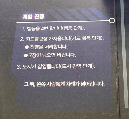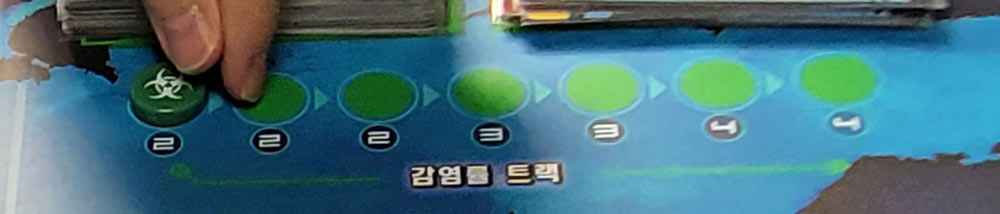 감염률 트랙 및에 적힌 숫자는 감염될 도시의 숫자다. 이게 2에서 3으로만 올라도 전염병 관리가 아주 힘들어진다. 보드게임을 하면서 전염병이란 이렇게 무섭구나 다시금 느끼고 만다. 어떻게 보면 교육용 게임이다.