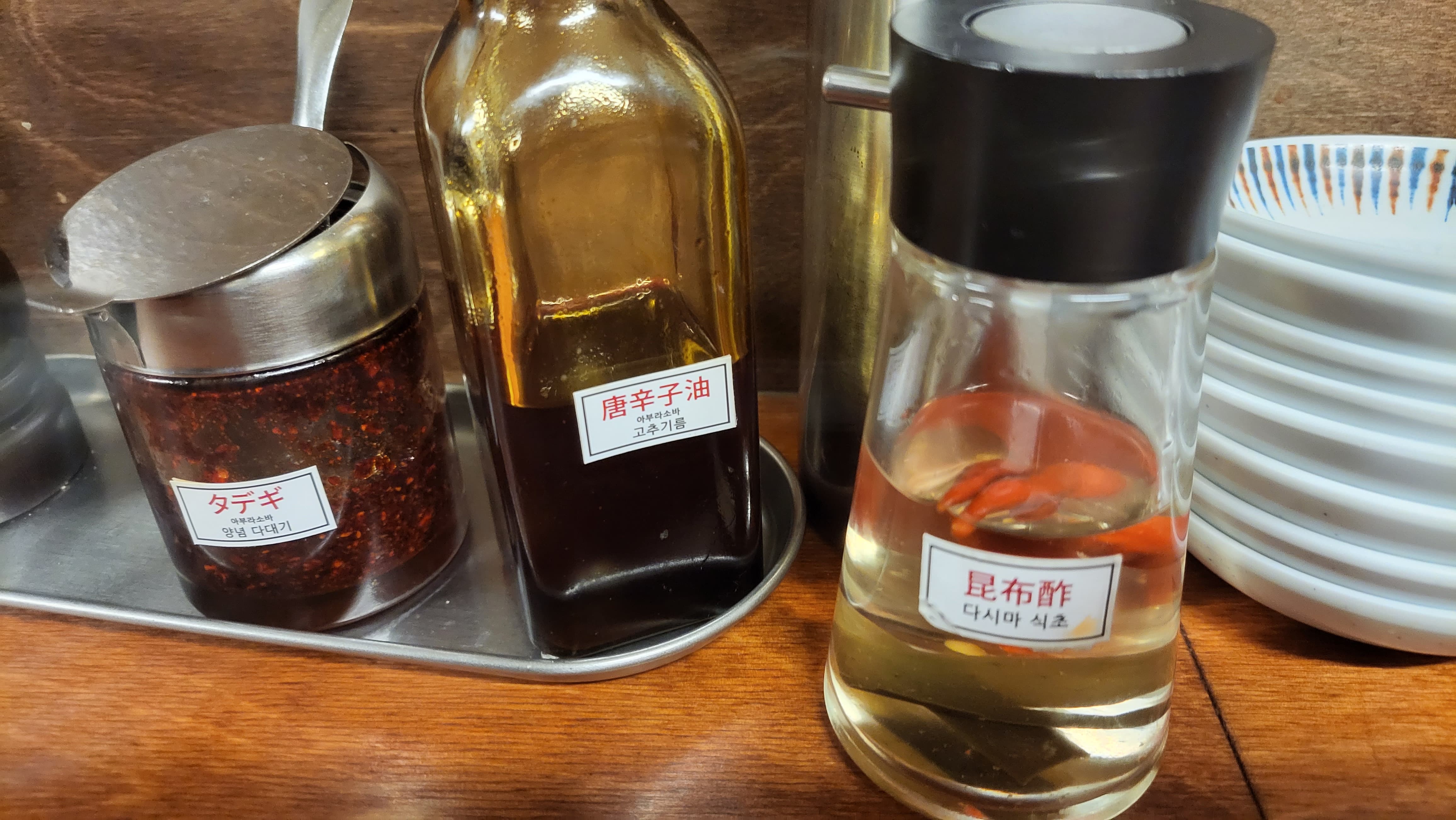 첫맛은 정말 맛있었지만 계속 먹으니 느끼했다. 사진엔 담지 못했지만 양념 다대기 옆에는 후추(?)도 있다. 절반을 먹고 나면 취향껏 양념을 넣어서 계속 맛의 변화를 주면서 먹는 걸 추천한다. 아부라소바 자체가 묵직한 느낌의 맛이 주라서 다시마 식초만 넣어서 먹었는데 끝에 고추기름과 양념 다대기도 넣어서 맛이 어떻게 변하는지 확인해 볼 걸 그랬다. 포스팅을 하는 지금에 와서야 좀 아쉽다.