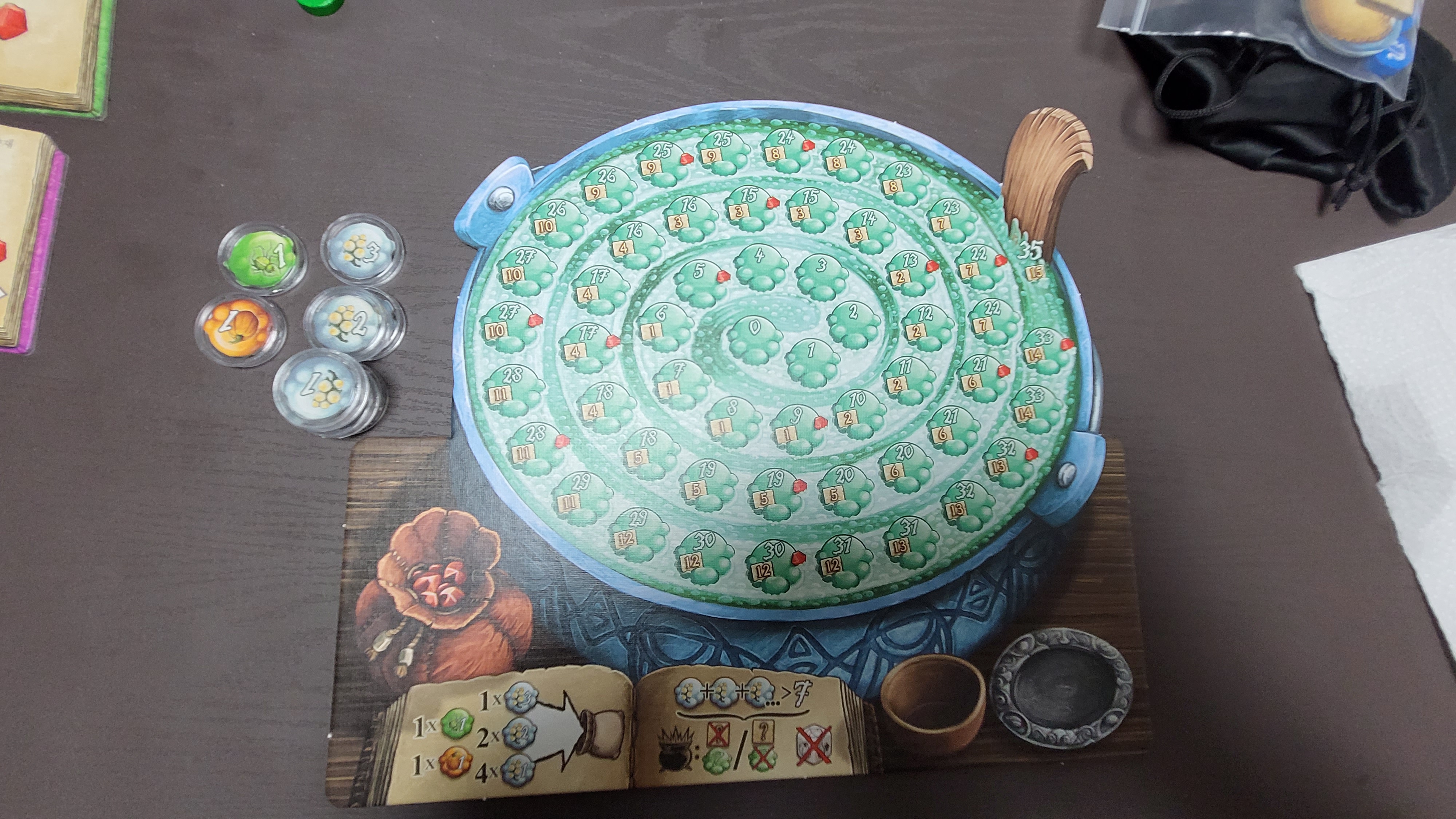 사진에 보이는 흰색 토큰은 꽝꽝나무란 재료인데, 개인판에 놓은 흰색 토큰의 점수가 7을 초과하면 솥이 터지게 된다. 따라서 참여자들은 자기 주머니에 흰색 토큰이 얼마나 들어있는지 생각하면서 토큰을 뽑아나가야 한다.