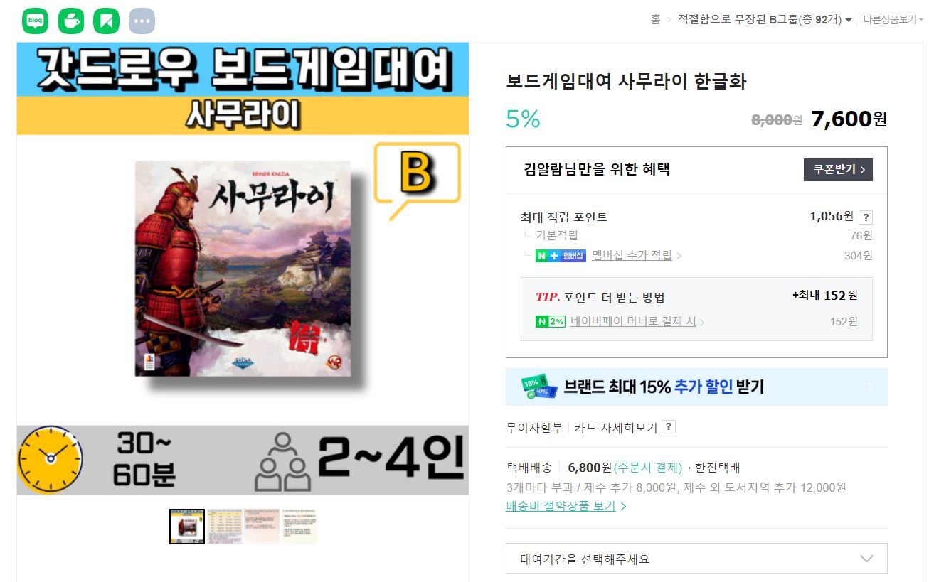 건대 보드게임 카페에서 플레이했었는데 절판된 게임인 것 같다. 하지만 보드게임 카페에서 할 수 있고 요즘엔 네이버에서 7000원 대로 대여해서 즐길 수도 있기 때문에 추천을 해 본다.